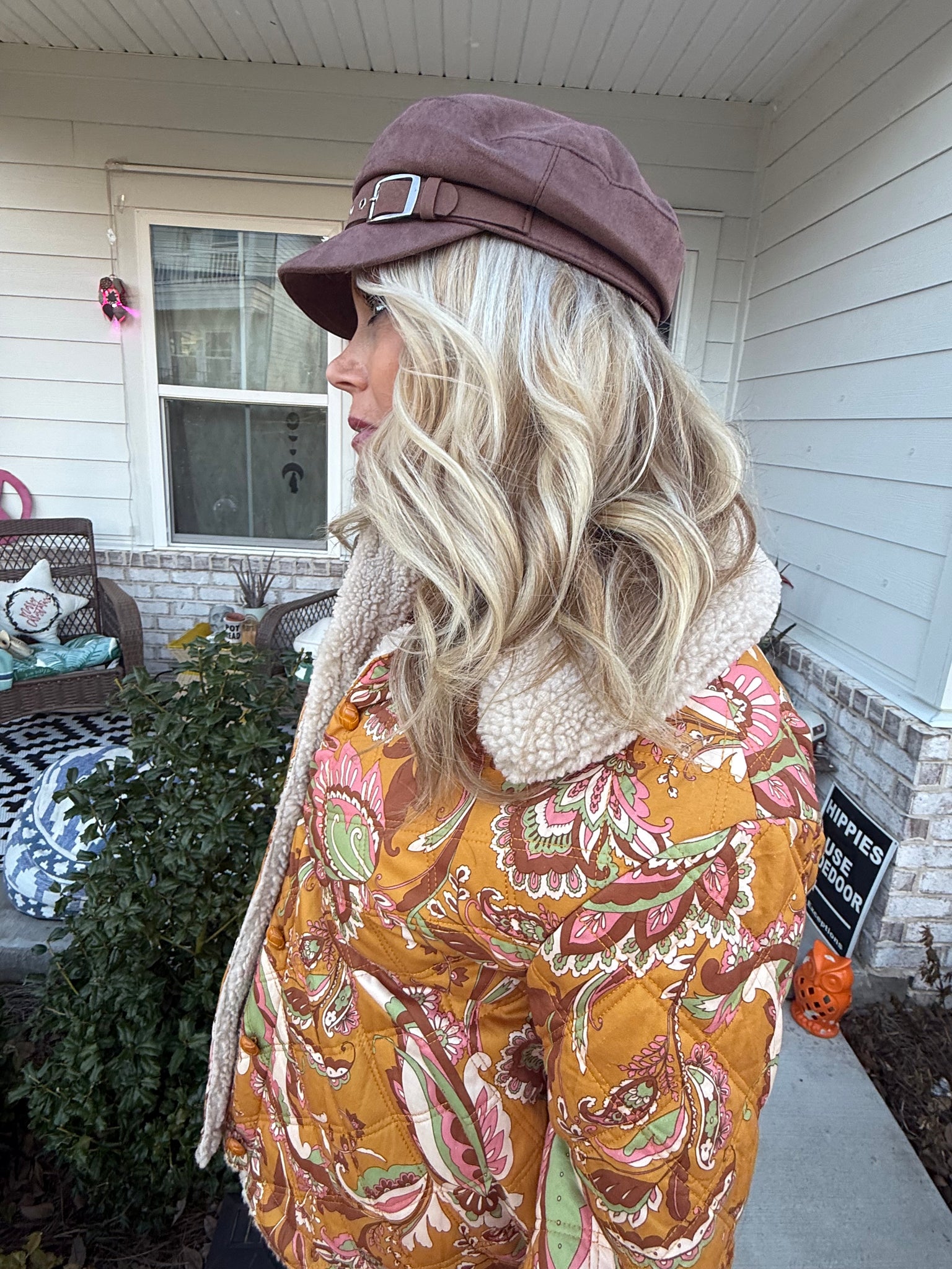 Step up your outerwear game with this stunning boho-chic sherpa jacket! Featuring a bold paisley print in warm, earthy tones, this jacket blends vintage vibes with a cozy modern edge. The quilted design is accented with brass-toned buttons and a plush sherpa lining, making it as comfortable as it is eye-catching. Perfect for layering over a distressed mini skirt or your favorite denim.